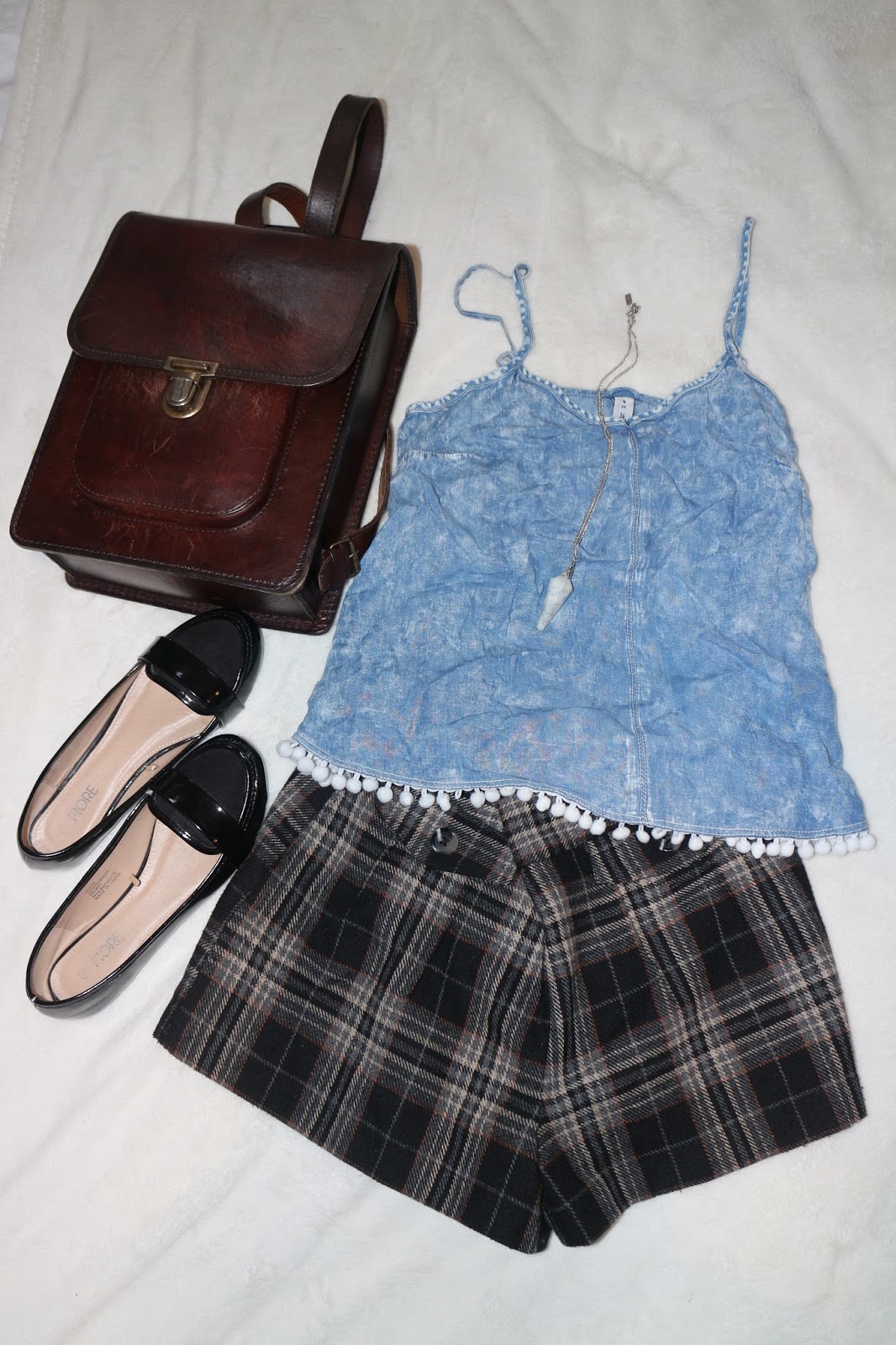 Hello my lovely and welcome, I hope you are having a good day? For today’s outfit lay, I was going for something casual with a little girly kinda style. So I paired my tartan shorts with a little blue number (both from Primark) to start off with, adding the flats (Matalan), pendant (REGALROSE) and my satchel (BearaBeara) to finish.