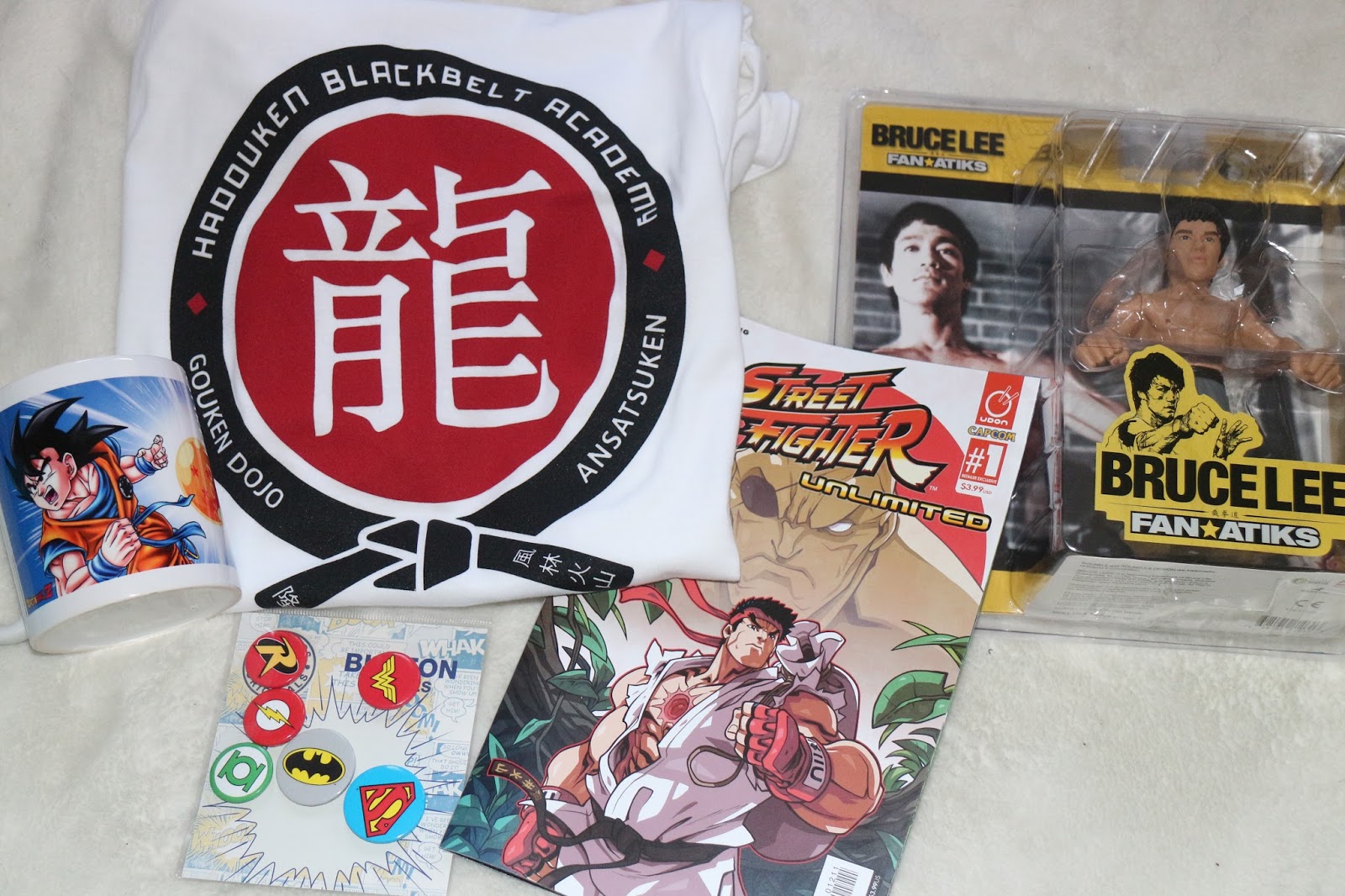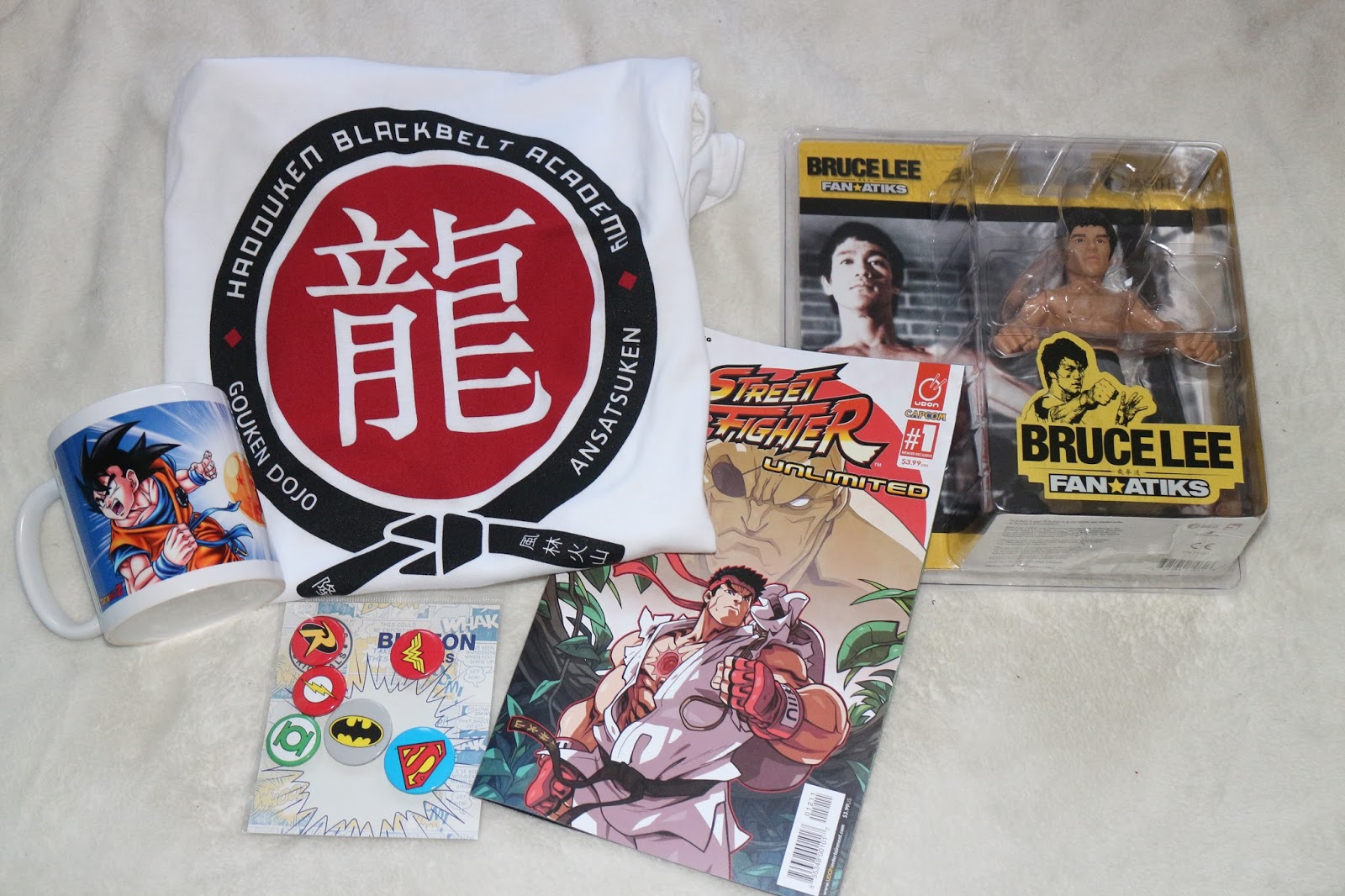 This box was filled with great contents, it contained a collectable Bruce Lee figurine, a Dragon Ball Z mug, an exclusive Street Fighter comic, Hadouken Black Belt Academy T-Shirt and my DC Comics Button Badges.